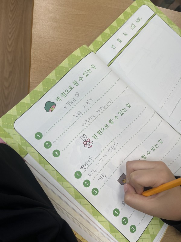 지폐 모형을 사용하여, 같은 가치를 지니지만 다른 형태를 띄울 수 있음을 아이들이 학습할 수 있도록 게임을 진행하여 지도하였습니다. 이를 통해, 돈의 종류마다 가지는 가치를 명확하게 구분할 수 있도록 하며, 돈을 사용해본 경험을 떠올려 그림일기를 작성하는 시간을 가졌습니다.