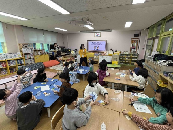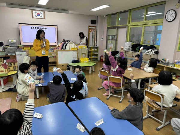 2교시 : 1교시에서 화폐의 종류와, 대소 비교를 연습한 것을 바탕으로 조를 나눠서 돈 조합 게임을 진행했습니다. 모의지폐를 나눠주고 화폐를 고루 사용하여 돈을 조합할 수 있도록 도와주며 게임을 진행했습니다.