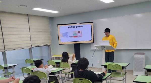 이어서 교육용 화폐를 배부한 뒤, 돈의 액수가 커질수록 화폐의 크기도 커진다는 점을 설명했습니다. 천원 다섯 장이 모이면 오천원이 되고, 오천원 두 장이 모이면 만원이 되는 식으로 단위를 조합하는 연습을 진행했습니다. 기본적인 조합 연습이 끝난 후에는 모둠 활동으로 확장해, 선생님이 제시한 가격을 가장 다양한 방법으로 조합하는 팀이 점수를 얻는 게임을 진행했습니다. 이 과정에서 어려움을 겪는 학생들에게는 직접 도움을 주며 함께 조합을 시도할 수 있도록 지도했습니다.
