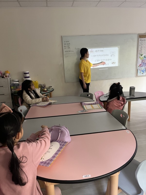 1교시에서는 '꼬마악어의 지갑 이야기' 수업을 진행했습니다. 이야기를 읽어주면서 중간중간 설명을 덧붙이고 예시를 들어주니 아이들의 집중도가 높아졌습니다. 특히, 인물들마다 목소리를 바꾸어 읽어주니 아이들이 재미있어하며 적극적으로 이야기 속으로 빠져들었습니다. 후속 활동에서는 많은 아이들이 저축을 해본 경험이 없어 저축에 관한 질문에 답하는 것이 어려워하는 모습을 보였고, 이에 따라 '저축을 하게 된다면 어떤 점이 좋을지'에 대해 글을 쓰도록 유도했습니다.