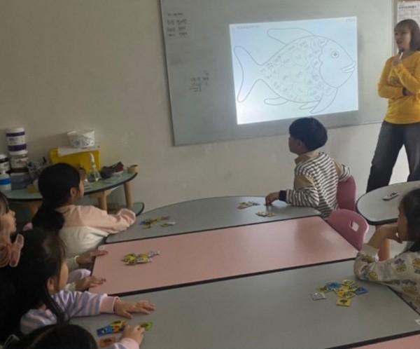 2교시: 그후 무지개 물고기 비닐 그리는 활동을 진행했습니다. 빔프로젝트로 화이트보드에 비출수 있어서, 내가 줄 수 있는것과 줄수 없는 것을 자유롭게 섞어서 말하고, 이에 대해 다같이 생각해보는 시간으로 변형하여 진행했습니다. 빔프로젝트 특성상 어두운 환경에서 잘보이는터라 불을 끄고 수업을 진행을 하여서 조금 어려움이 있었습니다