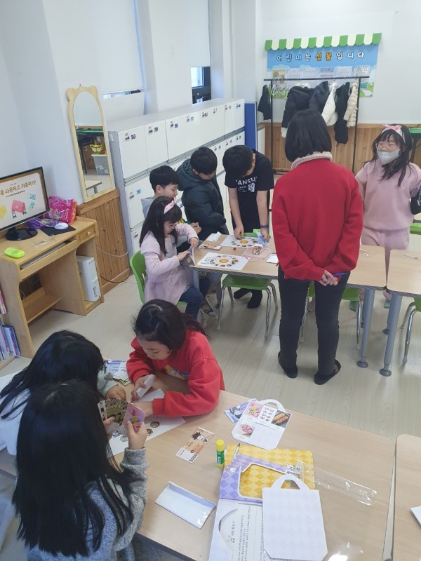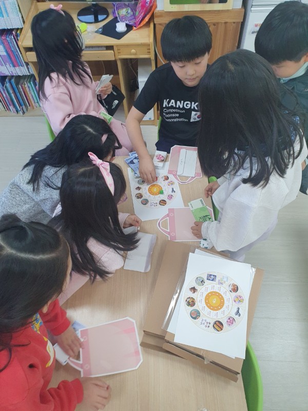 장바구니와 종이지갑을 만들어 시장놀이를 하기도 했다. 게임을 진행하면 추가로 돈을 준다는 말에 아이들이 능동적으로 참여하여 시장을 형성하기도 했다. 10000원이라는 한정된 돈으로 계획적이고 합리적인 소비의 중요성에 대하여 일깨워주는 시간이었다.