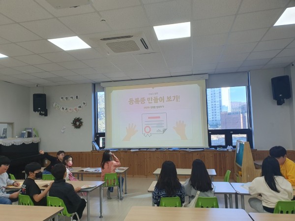이야기를 읽은 후에는 자신만의 등록증 만들기 활동을 진행하였습니다. 이 활동을 통해 아이들이 미래에 되고 싶은 직업에 대해 구체적으로 생각해보는 시간을 가질 수 있었습니다. 아직 장래희망이 없는 아이들에게는 평소에 자신이 좋아하는 활동이나 관심 있는 분야를 떠올려 보게 하였고, 이를 바탕으로 연관된 직업을 추천해주며 다양한 가능성을 탐색할 수 있도록 도왔습니다. 등록증에 각자의 꿈을 적어가며 자신만의 미래를 상상해보는 뜻깊은 시간을 보냈습니다.