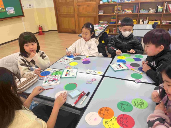 무지개 물고기의 이야기를 들려주면서 나눔에 대해 가르쳤습니다. 이후 무지개 물고기를 꾸미면서 무지개 물고기처럼 어떤 것을 나누고 싶었는지를 동그란 색종이 위에 그렸습니다. 동그란 색종이 위에는 아이들이 사랑, 행운, 행복 등과 같은 추상적이고 범위가 큰 것들을 많이 적는 모습을 보였습니다.