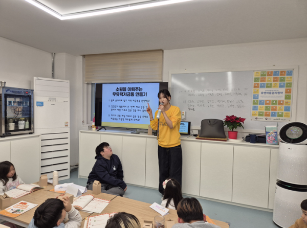 우유팩 저금통만들기가 어려울 수도 있어 수업 10분전에 미리 도착해 우유팩저금통을 먼저 만들어보았고, 아이들이 어려워하지 않도록 쉽게 설명했습니다. 먼저만든 친구들은 아직 못만든친구들을 도와 만들도록 했고 보조교사의 도움이 필요했던 차시였습니다.