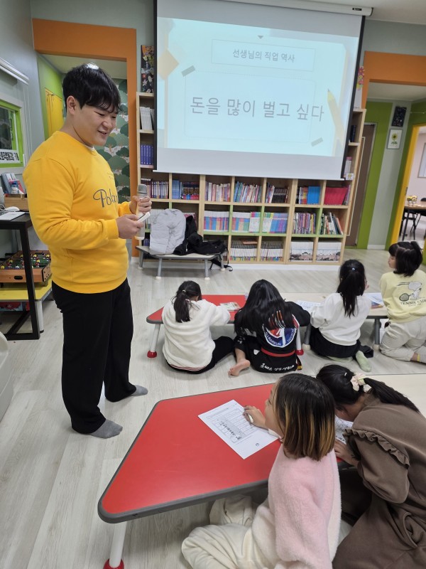 1교시에는 아이들과 함께 동화를 읽으며 직업이 무엇인지 알아보았습니다. 등장인물들이 어떤 직업을 가지고 직업에 따라 어떤 일을 하는지 학습했습니다. 이를 통해 본인이 어떤 직업을 하고 싶은지 직업을 통해 돈을 어떻게 버는지 알아보았습니다.
