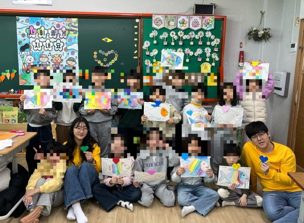 1교시에는 무지개 물고기 책을 읽는 시간을 가졌습니다. 이미 책의 내용을 알고 있는 학생들이 많이 있어서 집중력은 다소 떨어졌던 시간이었습니다. 책을 다 읽은 후 책 내용에 대해 질문하며 되새기는 시간을 가진 후 무지개 물고기를 꾸미는 시간을 가졌습니다. 색종이를 이용하여 꾸미거나 색연필로 색칠하도록 지도하였습니다.