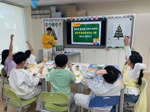 6주차 ‘은행은 어떤 곳인가요?’ 라는 주제로 수업을 진행했습니다. 수업을 시작하면서 돈이 가만히 있는지 돌아다니는지 간단한 퀴즈를 내어 아이들의 참여를 유도했습니다.