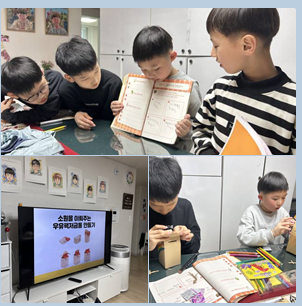 이 수업에서는 저축을 주제로 교육을 진행하였습니다. 아이들이 일상에서 쉽게 접할 수 있는 저금통을 통한 저축 개념을 시작으로, 은행에서 할 수 있는 예금과 적금에 대해 설명하였습니다. 또한 이자의 개념을 이해하기 쉽도록 ‘엄마 돈과 아기 돈’의 예시를 활용하여 학생들의 눈높이에 맞추어 설명하였습니다. 이후 활동으로는 우유곽을 활용한 저금통 만들기를 진행하고, 학생들이 각자의 저금통을 꾸민 뒤 앞에 나와 발표하는 시간을 가졌습니다. 이를 통해 저축의 중요성을 재미있고 자연스럽게 이해할 수 있도록 하였습니다.