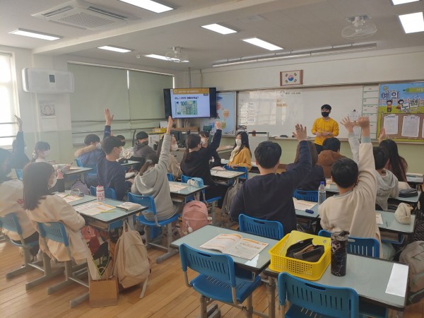 신승호 단원이 진행했습니다. 1교시에 배웠던 돈의 기능과 외화가 나타난 교구를 이용하여 돈카드게임을 진행했습니다. 4인 1조로 책상을 모아 게임을 진행했고 수가 맞지 않는 학생들이 있어 5명이 있는 조들을 만들어 조절했습니다. 학생들이 게임을 통해서 돈의 기능에 대한 4가지 기능을 익히고 각 10개의 나라의 화폐 단위에 대한 개념과 이해를 알아가는 시간을 가졌습니다. 열심히 참여해준 모든 아이들에게 간식을 주며 수업을 마무리 했습니다.