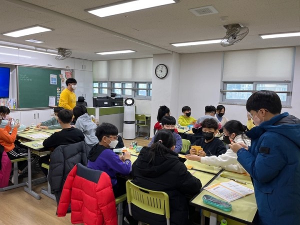 장다훈 단원이 진행했습니다. 1교시에 배웠던 돈의 기능과 외화에 대한 내용을 바탕으로 돈카드게임을 진행하였습니다. 4인 1조로 나누어 제한시간동안 돈카드 게임을 하고, 각 조에서 1등을 많이 한 학생에게는 간식을 제공하였습니다. 학생들이 게임을 통해서 돈의 기능에 대한 4가지 기능을 익히고 각 10개의 나라의 화폐 단위에 대한 개념과 이해를 알아가는 시간을 가졌습니다.