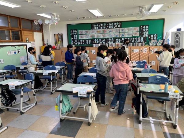 -2교시: 1교시에 배운 내용에 대한 골든벨 퀴즈를 진행한 후 '물물교환'에 관한 게임을 진행했습니다. 물물교환을 직접 해보면서 서로가 원하는 물건을 직접 교환해야 하는 물물교환의 어려움과 화폐의 필요성, 중요성에 대해 알아보는 시간을 가졌습니다. 수업을 마무리하면서 그동안 배웠던 내용에 대해 복습하는 시간도 보냈습니다.