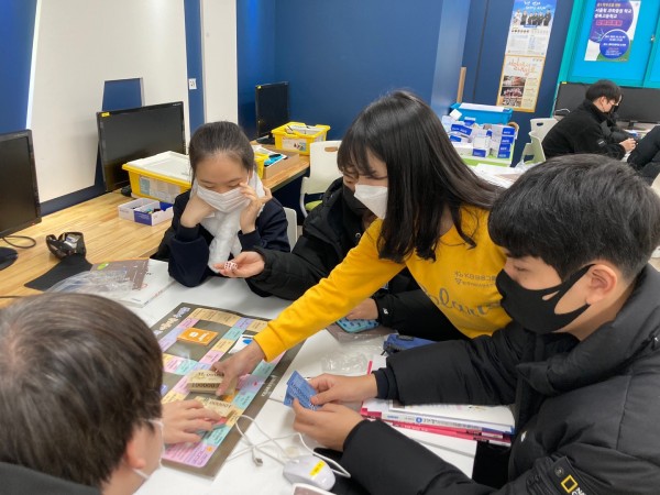 2교시(송하윤): 1교시에 배운 금융경제 수업 내용을 복습하고, 교구 수업에 앞서 게임 규칙을 설명하였습니다. 경제보드게임을 통해, 학생들이 경제 용어와 경제 지식을 재미있게 익힐 수 있도록 하였습니다. 추가 설명을 덧붙이며, 게임이 원활히 진행되도록 도왔습니다.