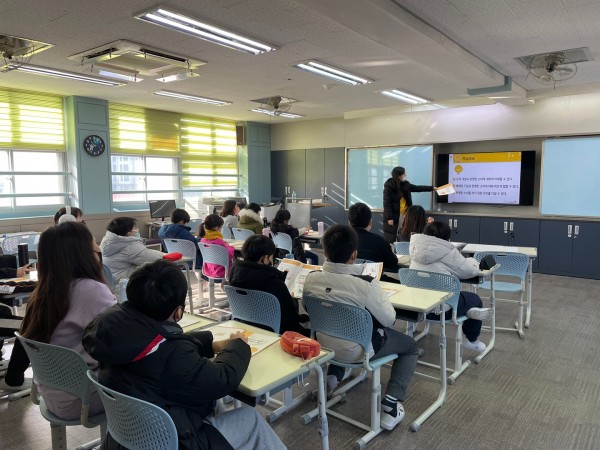 김가현 단원이 교재<내 친구 화폐, 현명한 소비>를 사용해 수업을 진행했습니다. 우선 수업 중 지켜야할 규칙에 대해 함께 읽어보고 오늘 배울 학습 목표에 대해 쉽게 풀어 설명했습니다. 여러 나라의 화폐를 이미지를 통해 보여주고 환율 맞추기 게임을 진행하며 흥미를 이끌었습니다. 현명한 소비 단원에서는 직접 찍은 여행 사진과 통장 내역 사진을 활용해 학생들이 재미를 느낄 수 있도록 했습니다. 마지막에는 수업 내용을 복습할 수 있는 골든벨 퀴즈를 함께 풀어보며 마무리했습니다.