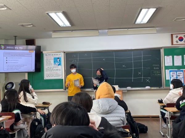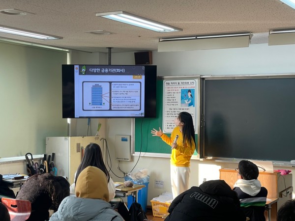 : 1교시 - 여민주 단원이 진행했습니다.수업 전 분위기 환기를 위해 선생님에 관한 퀴즈를 풀며 친해진 후 수업을 진행하였습니다. 금융의 개념과 일상 속에서 볼 수 있는 금융기관과 그 역할에 대해 배운 후 퀴즈를 통해 개념을 확인하였습니다. 저축과 투자의 개념과 그 차이에 대해 배우고 현명한 투자자가 되기 위한 조건을 학습하였습니다.