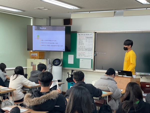 : 1교시 - 박호현 단원이 진행했습니다. 선생님에 대한 간단한 소개와 흥미를 끌 수 있는 간단한 퀴즈와 밸런스게임을 통해 학생들의 관심을 유발하였습니다. 동영상 시청을 통해 금융을 소개하고, 금융기관의 유형을 소개하였습니다. 저축의 필요성에 대해 설명하고 저축상품의 유형에 대해 함께 이해하는 시간을 가졌습니다. 투자에 대하여 알아보고 투자와 저축의 차이를 이해한 후 올바른 투자방법을 공부하였습니다.