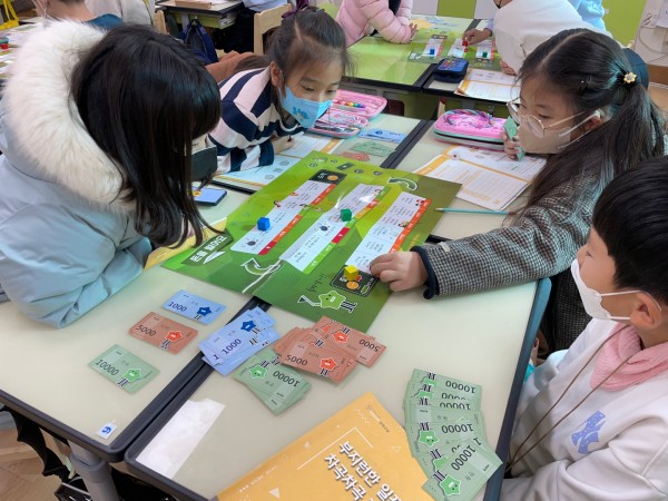 2교시- 1교시 내용을 바탕으로 골든벨 퀴즈를 진행하였습니다. 학급의 모든 아이들이 손을 들 었습니다. 또한 ‘돈을 벌어요’ 게임을 실시하였는데, 돈을 벌고 쓰는 활동으로 소득과 소비에 대한 이해도를 높였습니다.