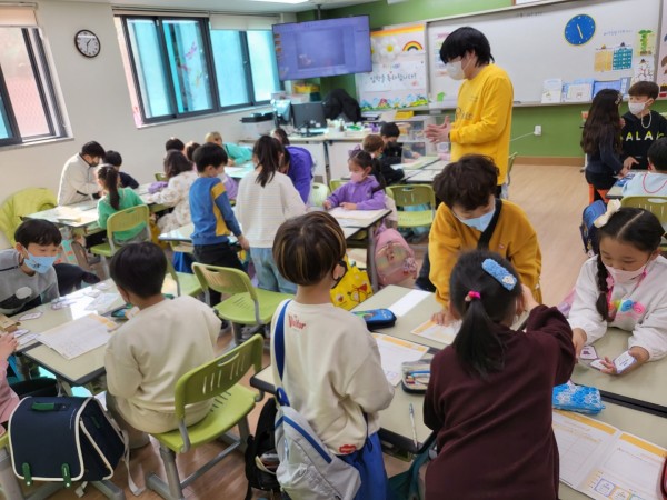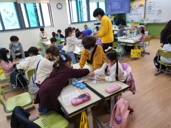 2교시- 1교시에 배운 내용을 바탕으로 골든벨 퀴즈와 물물교환 게임을 진행했습니다. 물물교환이 무엇이었는지 복습하고 미션카드와 자원칩의 차이점을 알려주었습니다. 그리고 학생들이 게임을 원활하게 하고, 물물교환의 단점을 알 수 있도록 도와주었습니다.