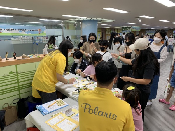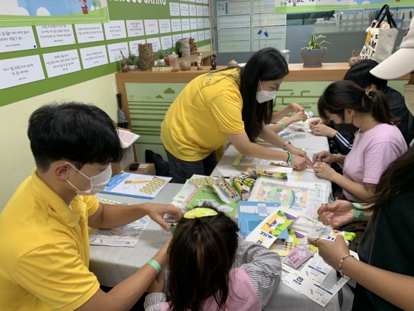 부스 운영 내용: 최민준, 이수빈, 김소현 단원이 재활용 우유갑을 활용한 필통 및 카드 지갑을 아이들과 함께 만들며 부스를 운영했습니다. 아이들에게 만드는 방법을 알려주기도 하고, 직접 만들어보면서 제작한 필통 및 카드지갑은 아이들이 가져가기도 했습니다.