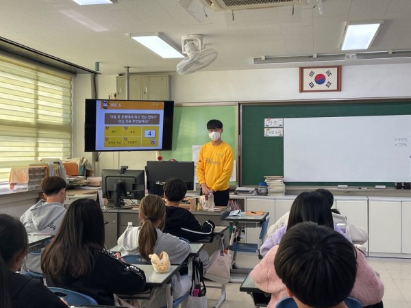 2교시: 이재혁 단원은 골든벨 퀴즈와 금융존 게임을 진행했습니다. 수수료 개념을 어려워하는 친구들에게 잘 풀어서 설명해주고, 주식을 설명할 때 자신의 투자사례를 잘 엮어 설명해주어 학생들이 재밌게 수업에 참여했습니다. 금융존 게임에서는 게임진행이 원활한 지 꾸준히 돌아다니며 봐주어 모두가 재밌게 게임에 참여했습니다.