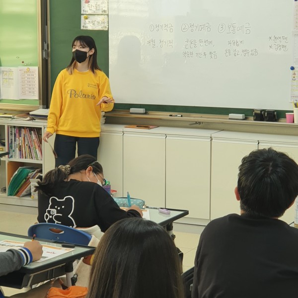 1교시: 김하영 단원이 금융과 금융기관은 물론 투자와 저축의 차이점에 대해 잘 설명해주었습니다. 특히 교재에는 없는 저축상품의 3가지 종류인 정기예금, 보통예금, 정기적금을 직접 칠판에 쓰며 학생들이 잘 이해할 수 있도록 도와주었습니다.