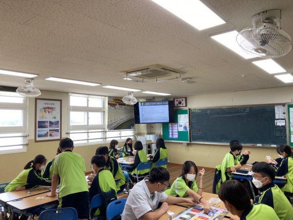 2교시: 1교시에 배웠던 내용을 다시 한번 정리해보고, 이를 바탕으로 골든벨 게임을 진행하였습니다. 골든벨 게임을 통해 수업 내용을 복습을 한 뒤, 교구를 이용하여 '튼튼한 자산관리 아름다운 우리집' 게임을 진행하였습니다. 모든 활동을 마친 뒤, 설문지 작성을 하고 질의응답을 통해 학생들이 수업과 관련하여 궁금했던 부분을 알아갈 수 있도록 하였습니다. 그리고 마지막으로 학생들과 같이 사진을 찍는 시간을 가졌습니다.