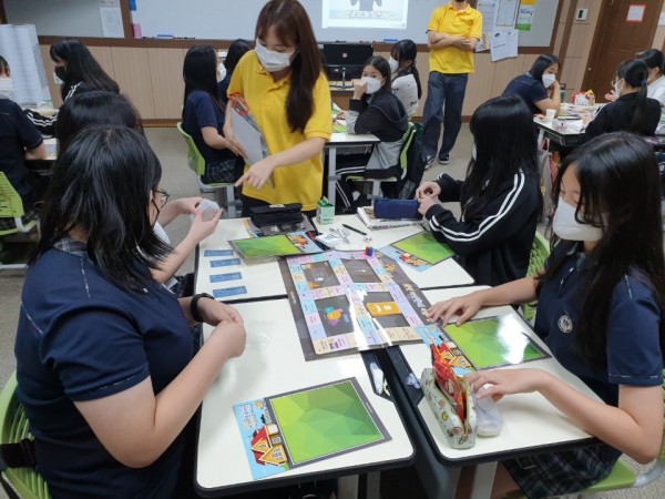 2교시: 5모둠으로 나누어 게임을 진행했습니다. 게임 활동을 하면서 모든 모둠이 즐겁게 게임에 참여하였습니다. 단원들은 각 모둠을 돌아다니며 학생과 적절히 상호작용하고 게임에 대한 질문에 답을 하며 원활한 게임의 진행을 도우는 역할을 했습니다. 게임을 마친 이후에는 게임에서 우수한 성적을 거둔 모둠에게 상품을 증정하였습니다.