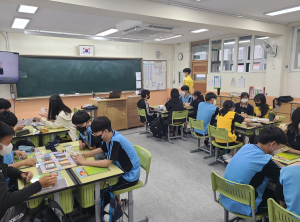 2교시 : 김진형 단원이 교구 수업을 진행하였습니다. 총 4개 조로 나누어 교구 수업을 진행하였으며 김진형 단원의 교구에 대한 전반적인 설명 이후 학생들이 헷갈릴 수 있는 부분에 대해 다시 강조하여 교구 수업에 무리가 없도록 하였습니다. 행복카드는 옆 사람, 행운카드는 본인이 뽑는 것임을 지속적으로 돌아다니며 설명하였습니다. 또한 현재는 폐지된 '신용등급제'에 대해 설명하고 '신용점수제'에 대한 간략한 설명을 하여 정확한 경제 정보를 전달하였습니다.