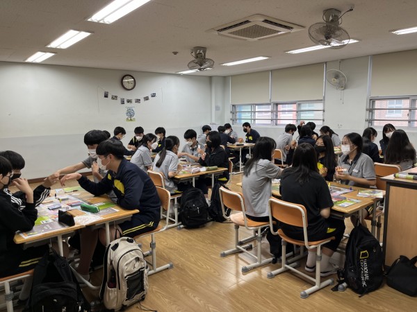두 번째 교시에는 조별 교구 활동을 진행했습니다. 보드게임 형식의 활동이다보니 아이들이 매우 즐겁게 참여했습니다. 남는 시간동안에는 설문조사지 작성과 사진촬영을 끝으로 수업을 마쳤습니다.