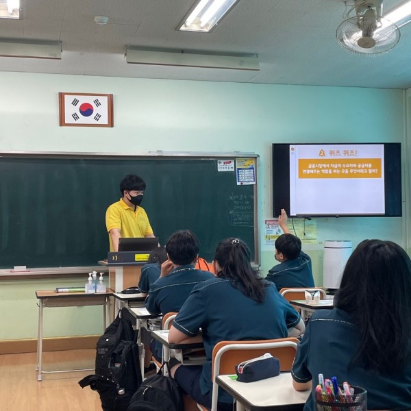 처음 접하는 '크라우드 펀딩'의 개념에 대해서도 사례를 들어 학생들에게 설명하고 직접 조를 꾸려 실습을 해보는 시간을 가졌습니다. 각자마다 가진 특색 있는 사업을 구상하였고, 친구들 앞에서 발표하며 앞서 배운 내용을 활용하고 다시 확인해보는 계기가 되었습니다.