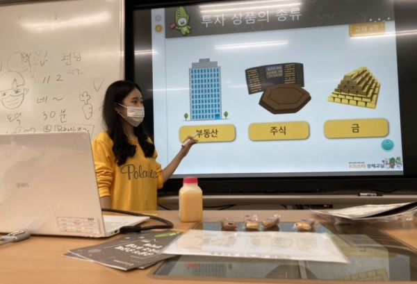 1교시 : [금융이 궁금해, 저축과 투자를 부탁해] 교재로 금융의 개념과 저축과 투자, 크라우드 펀딩 등에 대하여 스토리텔링 방식으로 수업을 진행하였고, 골든벨 퀴즈로 복습하였습니다.
