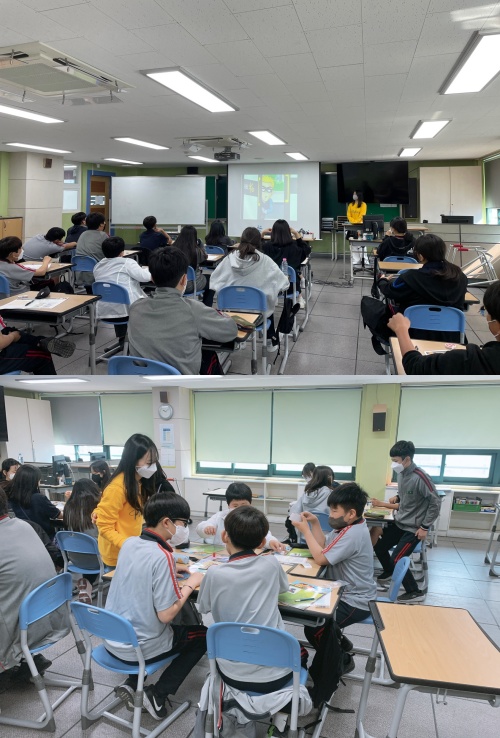 2교시의 경우 최시영 단원이 게임을 진행하였습니다. 4~5명의 모둠을 이루어 게임이 진행되도록 하였으며 학생들의 게임 관련 질문에 돌아다니며 응답하였습니다. 게임 마무리와 자리 정리까지 시간 내에 마칠 수 있도록 학생들과 적절하게 시간을 조정하였습니다.