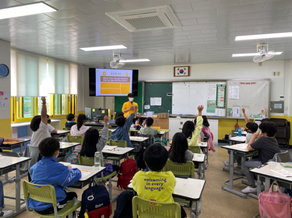 1교시 교재 수업에서는 원채연 단원이 진행을 맡았습니다. <내 친구화폐 현명한 소비>수업을 진행하면서 학생들에게 질문과 참여를 많이 유도하고 경험을 이야기하며 수업 흥미 유발을 많이 하였고 학생들이 한번에 이해하기 힘든 내용에 대해 주변에서 한번쯤은 겪어보았을 내용을 예시를 들어 이해를 도와주었습니다.