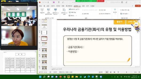 온라인 수업으로 1교시는 교재를 가지고 금융과 저축, 투자에 대해 교육했습니다. 사전에 받은 자리배치표를 바탕으로 친구들의 이름을 한명씩 호명하며 아이들이 졸지 않고 수업에 참여할 수 있도록 노력했습니다.