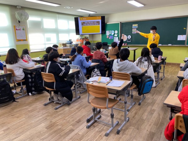 1교시 : 수업을 진행하기에 앞서 간단하게 선생님을 소개하고 아이스브레이킹 시간을 가짐으로써 아이들이 경제금융수업에 집중할 수 있도록 흥미를 유발했습니다. 학습목표를 소리내어 읽어보며 '신기한 돈, 합리적 소비' 수업을 통해 배울 내용을 알아보았습니다. 돈의 기능인 교환수단, 대가지불수단, 가치비교수단, 가치저장 및 이전수단에 대해 각각 일상 속 사례를 들어 이해를 도왔습니다. 이어서 환전과 환율의 의미를 설명하고 세계 여러나라의 화폐를 연결해보며 미니퀴즈도 함께 진행했습니다. 합리적 소비 단원에서는 설명과 함께 교재 예산 세우기 활동과 결산하기를 직접 채워보면서 예산과 결산을 배웠습니다.