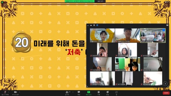 유채민 단원이 진행했습니다. 코로나19로 인해 온라인 수업으로 전환되어 1교시 수업내용과 경제상식을 주된 내용으로 O,X 퀴즈를 만들어 2교시 게임을 진행하였습니다. 문제를 크게 읽어주고 생각할 시간을 충분히 준 후 머리 위로 O, X를 표시하게 했습니다. 또한 퀴즈를 풀면서 배웠던 내용을 다시 한번 상기시켜주었습니다. 줌 수업으로 소통의 어려움이 있을까 걱정했지만 학교에서 수업을 듣는 친구, 집에서 수업을 듣는 친구 모두 적극적으로 참여해줘서 수업을 무사히 마칠 수 있었습니다.