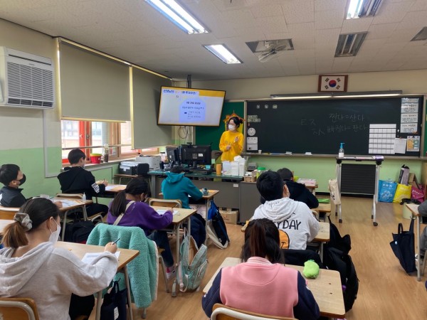 김다은 단원이 진행했습니다. 게임을 시작하기에 앞서서 1교시의 내용을 간단히 복습하며, 2교시 게임과 어떤 연관이 있는지 알려주었습니다. 이를 토대로 <선생님의 몸무게에 투자하라>게임을 진행했습니다. 게임의 방법을 알려주면서 칠판에 [찐다=산다 / 빠진다=판다] 의 공식을 적으니 아이들이 칠판을 보고 게임에 수월하게 참여할 수 있었습니다. 또한 힌트가 끝나고 정답이 나올 때마다, 찐다고 한 친구들은 얼마를 얻었고 빠진다고 한 친구들은 얼마를 얻었다는 것을 계속해서 말로 풀이해주었습니다. 힌트를 제시해줄 때는, 다양한 가능성이 열려있음을 강조했습니다. 또한 주식을 살지, 팔지 결정하는 시간 동안에는 어려워하는 아이들을 1:1로 알려주었습니다. 마지막에는 1,2,3등에게 간식을 증정하면서 주식은 돈을 벌 수도 있지만 잃을 수도 있다는 사실을 다시 강조하였습니다.