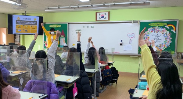 1교시에는 '내 친구 화폐, 현명한 소비'교재와 시청각 자료를 통해 돈의 역사, 현명한 소비에 대해 학습하였습니다. 2교시에는 1교시 학습내용을 바탕으로 골든벨 퀴즈를 진행하여 복습했고, 오늘 배운 단어들을 활용한 빙고게임을 진행하며 즐겁게 마무리했습니다.