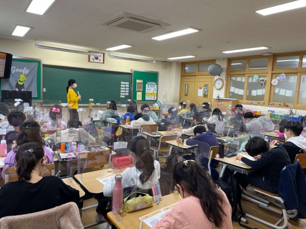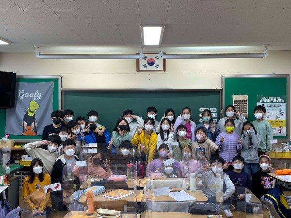 2교시 : 1교시에 배웠던 키워드를 중심으로 골든벨 퀴즈와 빙고게임 활동을 진행했습니다. 이를 통해 배웠던 내용을 복습하고, 키워드에 대한 간단한 질의응답 시간도 가질 수 있었습니다. 학생들 역시 퀴즈나 게임을 이용하여 배운 내용을 복습하는 시간을 가지니 즐겁고 적극적으로 학습에 임하는 모습을 보였습니다. 배운 내용에 대해 아이들이 잘 기억하고 있다는 것도 확인할 수 있었습니다. 골든벨 퀴즈와 빙고게임이 끝난 후에는 설문조사를 진행하며 수업을 마무리했습니다.