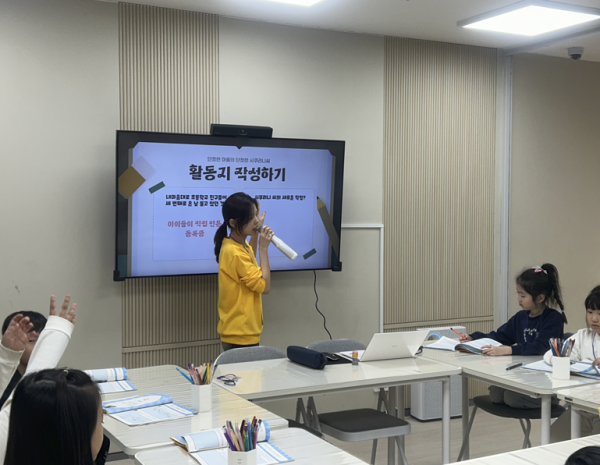 등록증을 발표하면서 자신의 생각을 자신 있게 표현하고 친구의 의견을 존중하는 태도를 기를 수 있게 했습니다.
