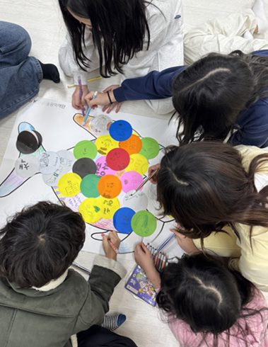 4) 수업 내용 : 무지개 물고기 이야기를 함께 읽고 나눔의 경험, 나눔의 중요성에 대해 이야기해보는 시간을 가졌습니다. 이후에는 무지개 물고기를 다같이 꾸며보고 그동안 배웠던 내용을 정리하는 시간도 가져보았습니다.