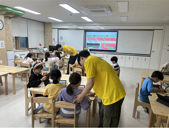 - 우선, 태블릿으로 진행하는 수업이다보니 아이들의 일탈행동(유튜브 본다던지 등)을 모두 방지할 수 없습니다. 따라서 보조 교사가 이리저리 돌아다니며 자제시키는 것이 필수적입니다. 또한, 메인 강사 선생님도 같이 게임에 참여해서 게임 속의 퀴즈를 못푸는 아이들을 위해 천천히 퀴즈 정답을 알려주는 것도 좋은 것 같습니다.