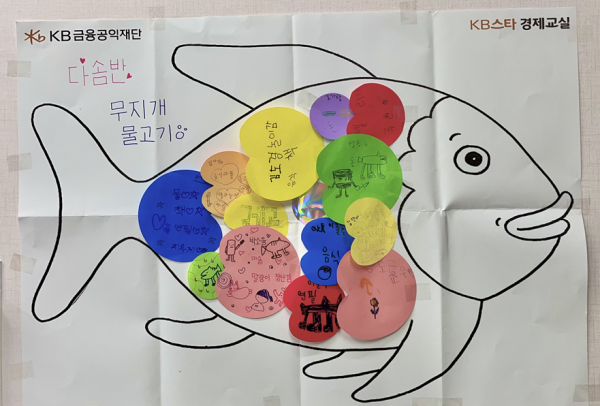 2교시(권승리): 물고기 판을 벽에 붙인 후, 물고기 비늘을 아이들에게 고르게 한 뒤, 활동지에 썼던 내용 중, 나눌 수 있는 소중한 것을 비늘에 글이나 그림으로 표현하도록 지도했습니다. 그