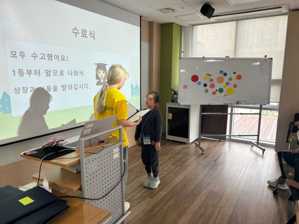 이후 소감 공유회를 통해 각자가 가장 인상 깊었던 차시를 이야기하고, 칭찬도장 시상식을 진행하였다. 공동 2등이 3명이나 되는 등 근소한 차이로 등수가 갈리며 레고 선물을 못 받은 아이들도 있어 아쉬움을 표하기도 했지만, 전체적으로는 즐거운 분위기 속에서 마무리되었다. 마지막으로 한 명씩 앞으로 나와 강사들이 직접 만든 수료증을 받는 수료식도 진행했다. 상장 수여식처럼 진지하게 임하며, 평소에는 종이를 구기던 아이들도 수료증은 소중히 가방에 넣는 모습을 보여주었다.5) 통합소감/느낀점