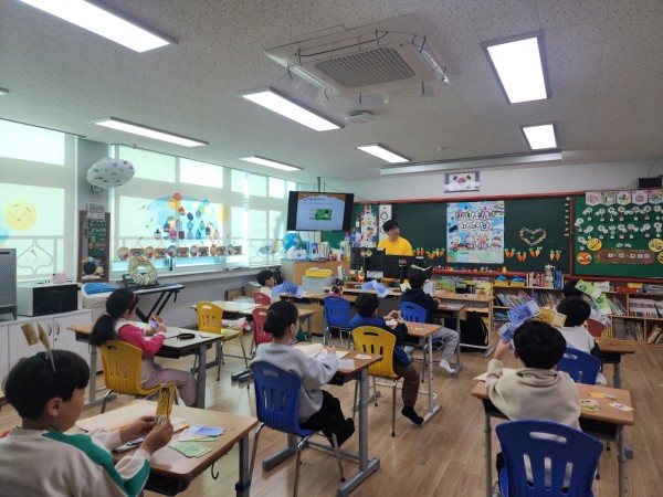 1교시 : 수업 진행에 앞서 교재 배부 및 교구를 배부하였습니다. 수업의 시작으로 강사 소개와 수업소개를 하고 진행하였습니다. 「사라진 돈」이라는 동화를 함께 읽고 화폐의 필요성을 느끼게 되는 시간을 가졌습니다. 아동들과 현재와 미래의 화폐에 대하여 이야기를 나눴고 물물교환게임을 진행하였습니다. 이후 지폐와 동전을 완성해보는 시간을 가졌습니다.