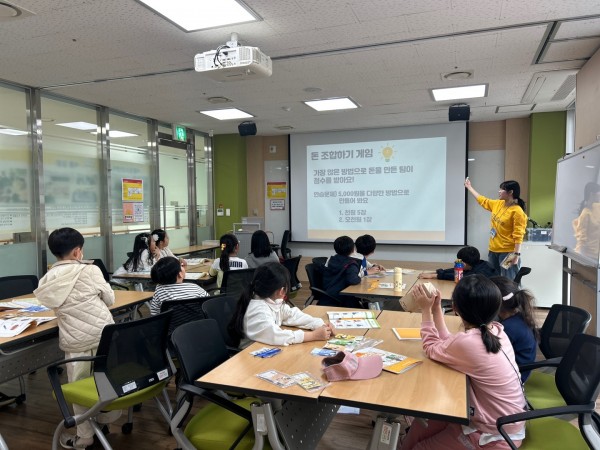 ‘이건 얼마예요?’를 주제로, 물건을 살 때 왜 충분히 고민해야 하는지를 중심으로 수업을 진행했다. 비싼 물건일수록 더 많은 돈과 그에 상응하는 시간과 노력이 필요하다는 점을 아이들의 눈높이에 맞춰 설명했다. 또한, 물건을 사기 전 생각해봐야 할 4가지 질문을 함께 외우며 소비 습관에 대한 사고를 유도했다. 이어서 우리나라 지폐와 동전의 종류, 단위별 크기, 지폐에 그려진 인물 등에 대해 알아보았고, 돈의 가치에 대한 개념도 함께 익혔다.2교시 (유혜윤) : 팀별 돈 조합 게임