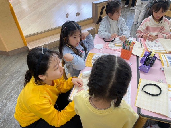 머리띠를 만들 때 아이들이 저에게 정중하게 도움을 청하는 모습이 귀여웠습니다. 두 번째 만남이라 아이들이 저희와 첫 번째 수업 때보다 더 유대감을 느끼는 것 같아 수업을 진행하기에 더 수월했습니다. 다만, 아이들의 질문과 반응에 다 호응을 해주다 보니 시간 조절에 어려움을 겪어 다음 수업부터는 수업 운용을 효율적으로 해야겠다는 생각이 들었습니다.
