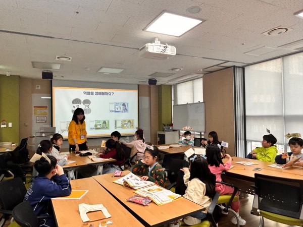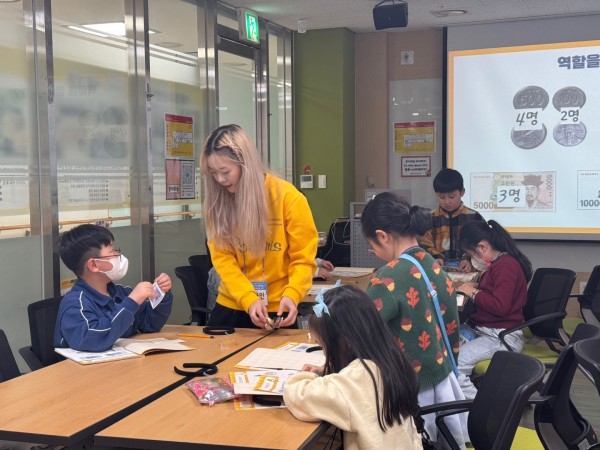 수업에 앞서 선생님과 학생들이 서로를 소개하며 라포를 형성했다. 이 과정에서 아이엠그라운드 게임을 활용하여 학생들이 친밀감을 느낄 수 있도록 도왔다. 이어서 '사라진 돈' 이야기를 함께 읽었고. 생활 속 다양한 예시를 들어가며 화폐의 필요성에 대해 설명하였다. 또한 기존 교안의 내용이 어려울 수 있어 어린이들의 이해를 돕기 위해 내용을 간소화하여 전달하였다. 생각보다 많은 아이들이 물물교환의 개념을 이미 이해하고 있었고, 화폐의 필요성 역시 잘 파악하고 있었다.